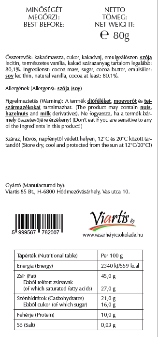 Összetevők: Kakaómassza, kakaóvaj, cukor, emulgeálószer: szójalecitin, természetes vanília, kakaó szárazanyag tartalom legalább 80,1%.
