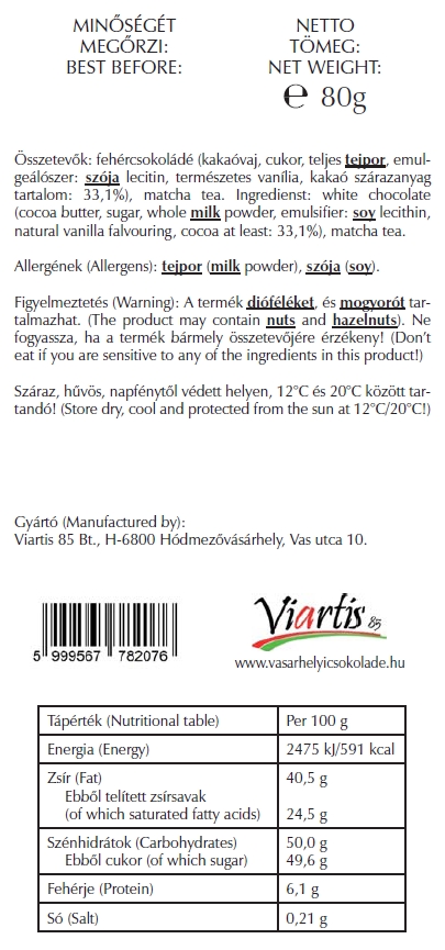 Összetevők: Fehércsokoládé (kakaóvaj, cukor, teljes tejpor, emulgeálószer: szója lecitin, természetes vanília, kakaó szárazanyag tartalom legalább 33,1%), matcha tea.