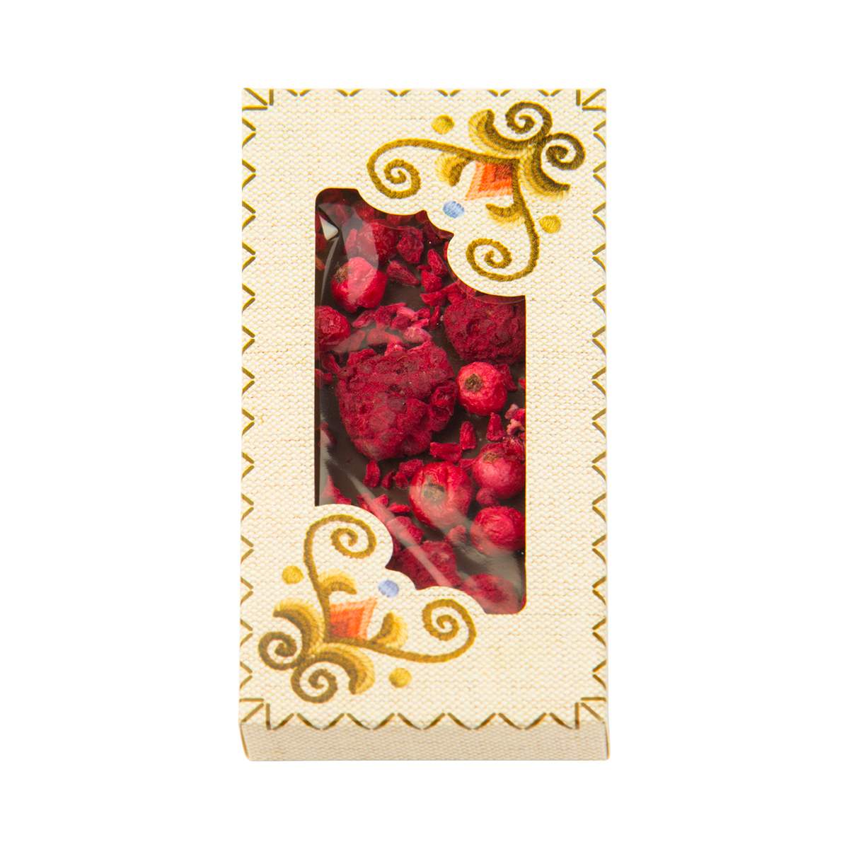 Összetevők: Étcsokoládé (kakaómassza, kakaóvaj, cukor, emulgeálószer: szójalecitin, természetes vanília, kakaó szárazanyag tartalom: 73%), liofilizált málna szemek, liofilizált piros ribizli szemek, liofilizált málna darabok.