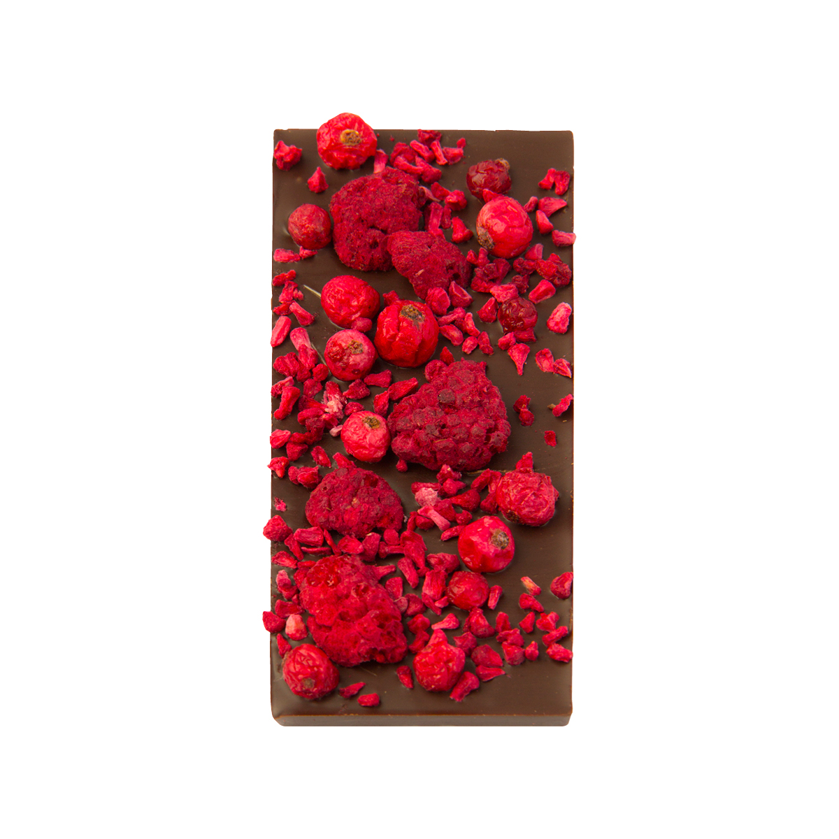 Étcsokoládé liofilizált málnával és liofilizált piros ribizlivel.