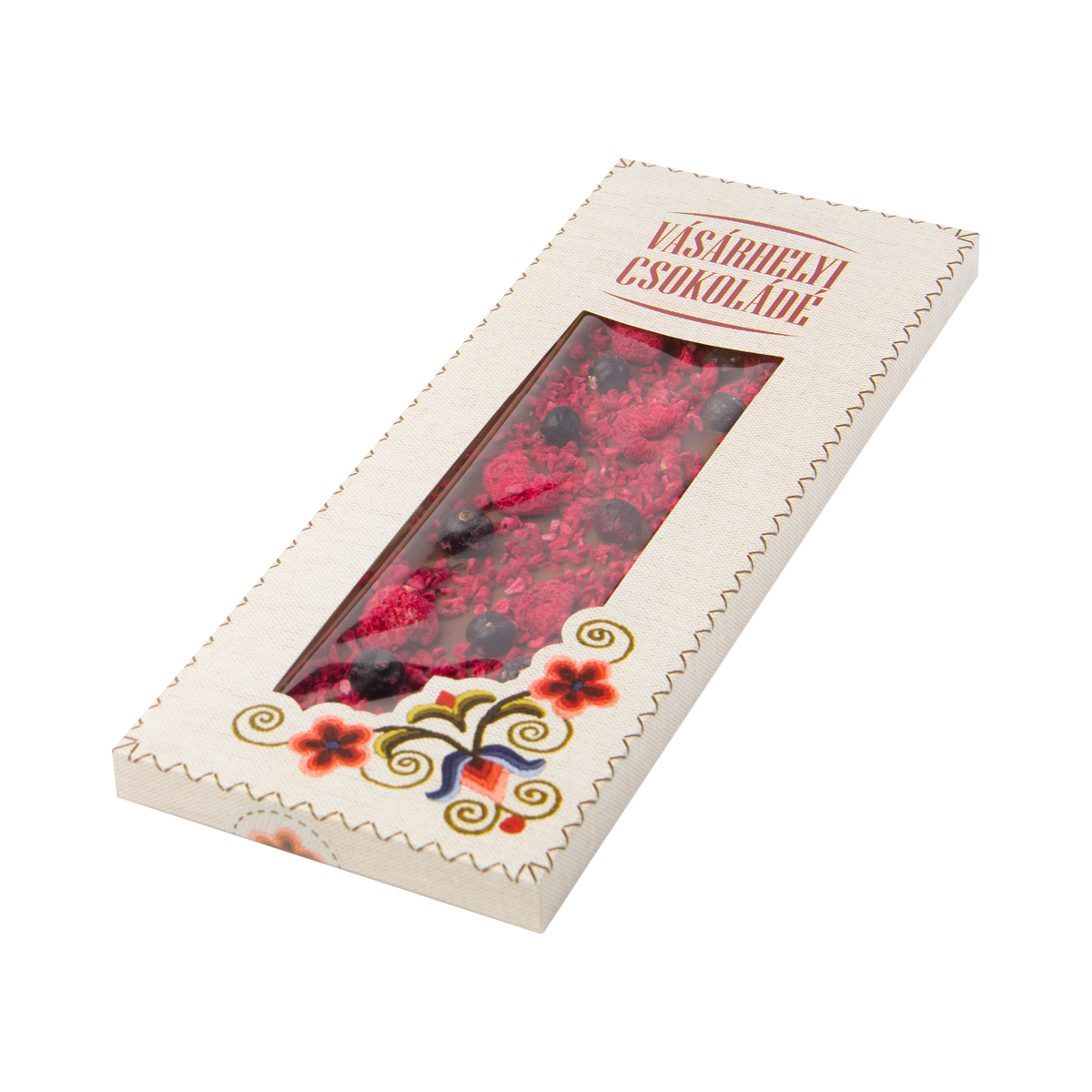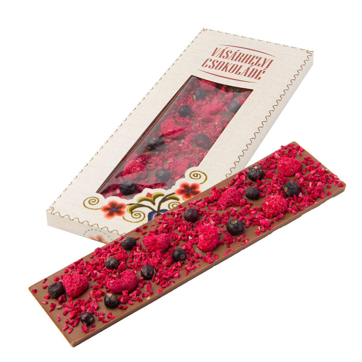 Tejcsokoládé málnával és fekete ribizlivel (110g)