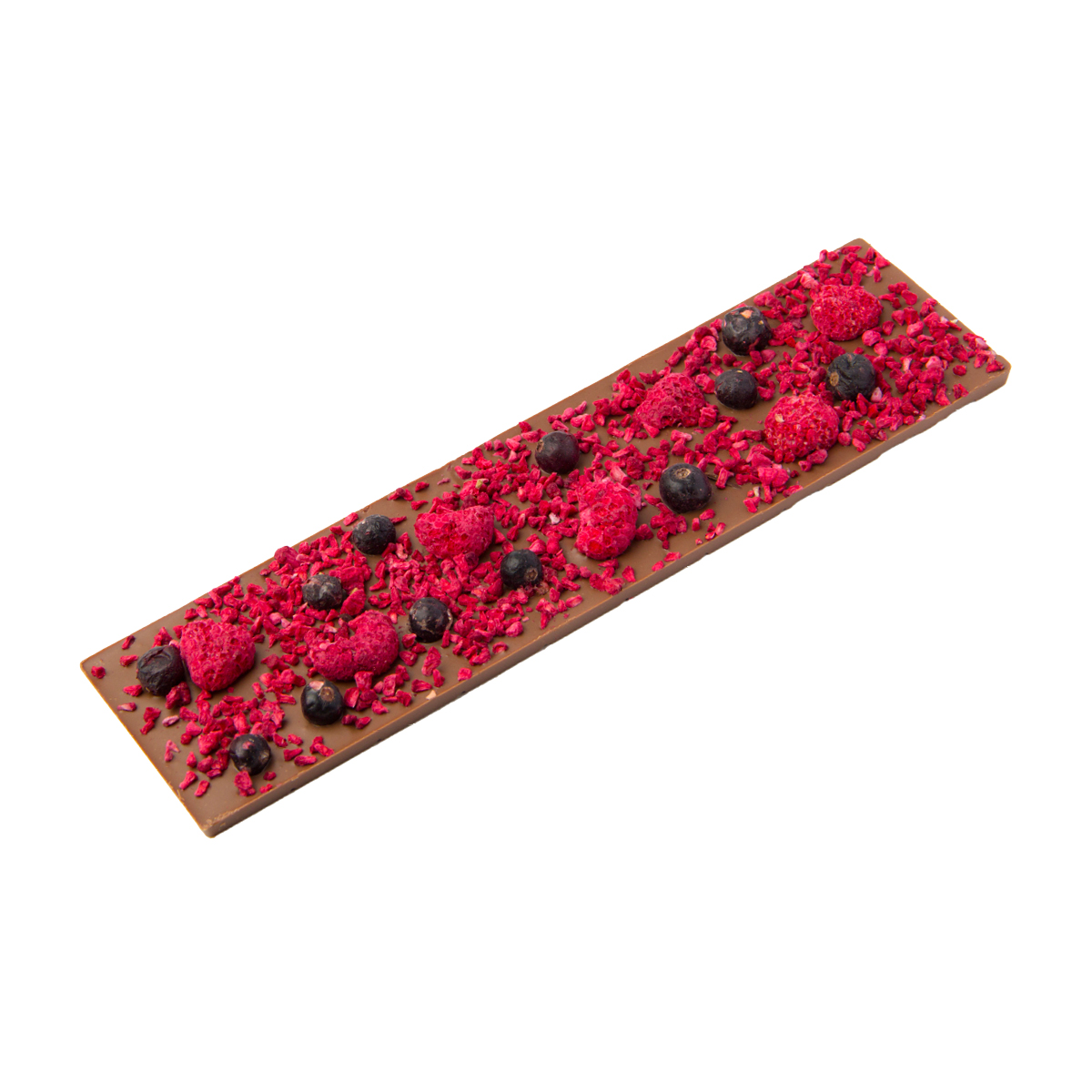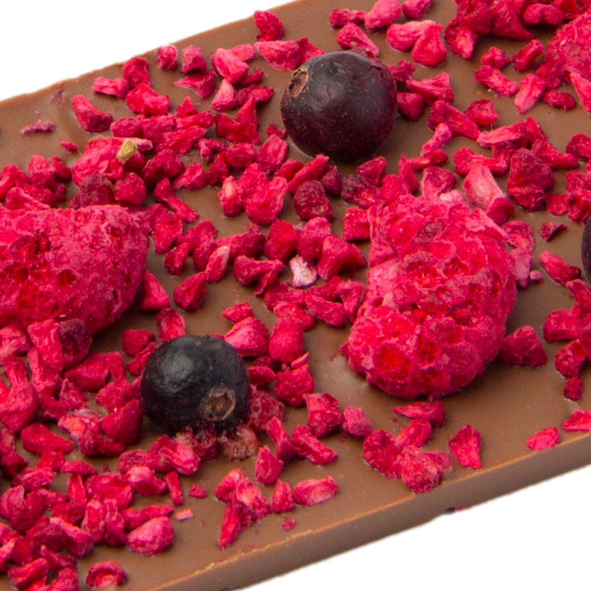 Tejcsokoládé liofilizált málnával és liofilizált fekete ribizlivel