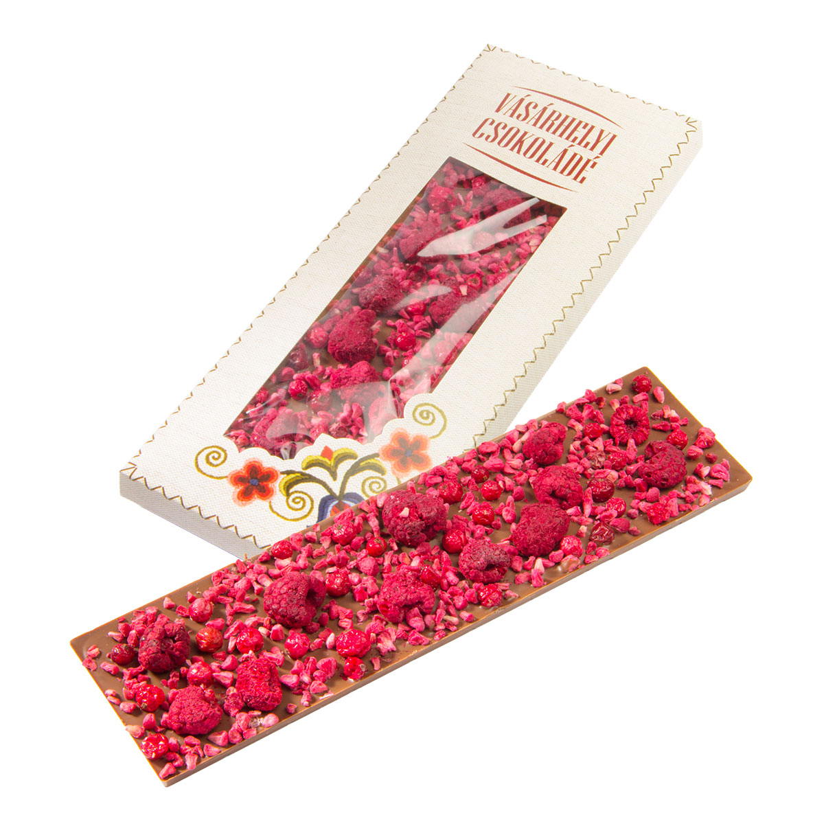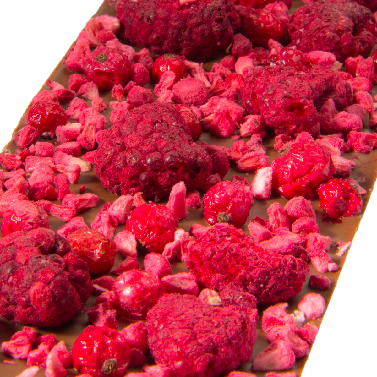 Tejcsokoládé liofilizált málnával és liofilizált piros ribizlivel